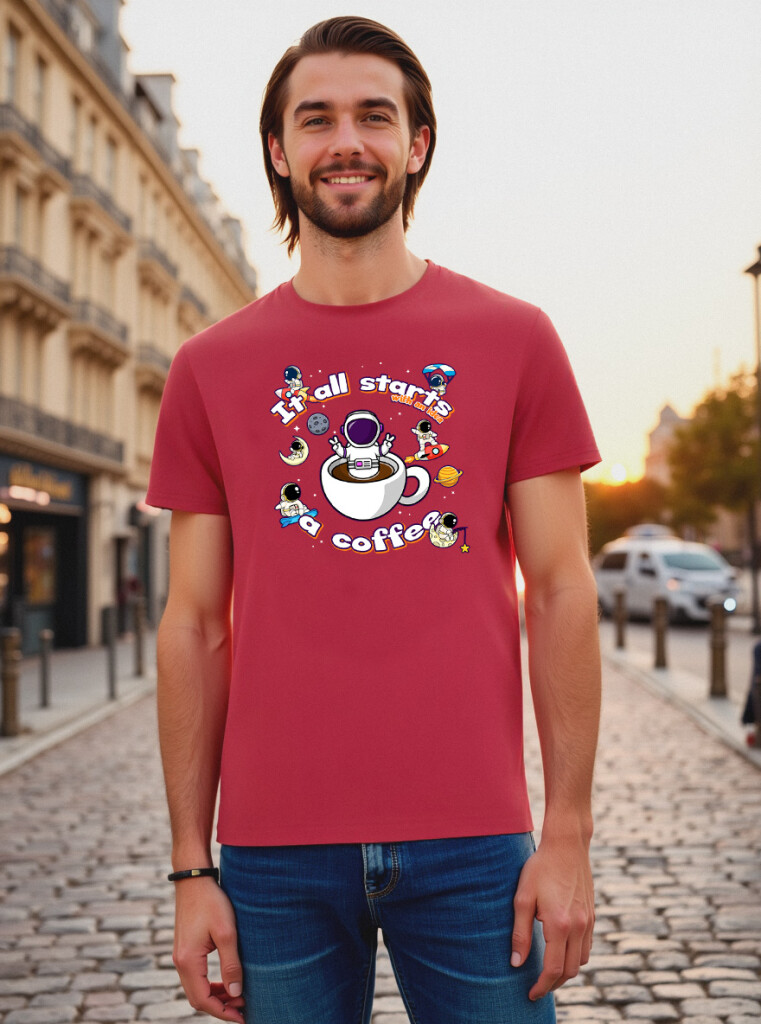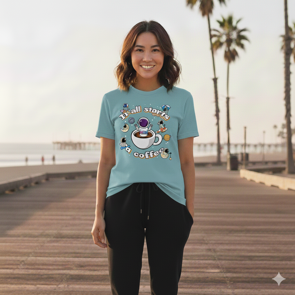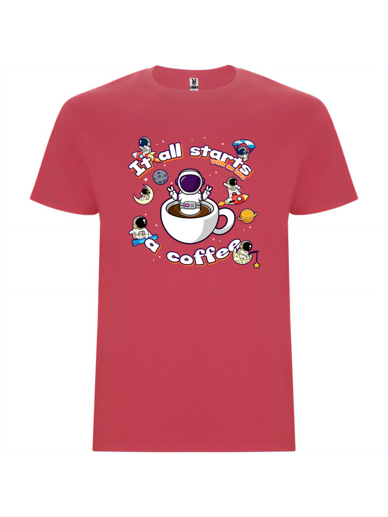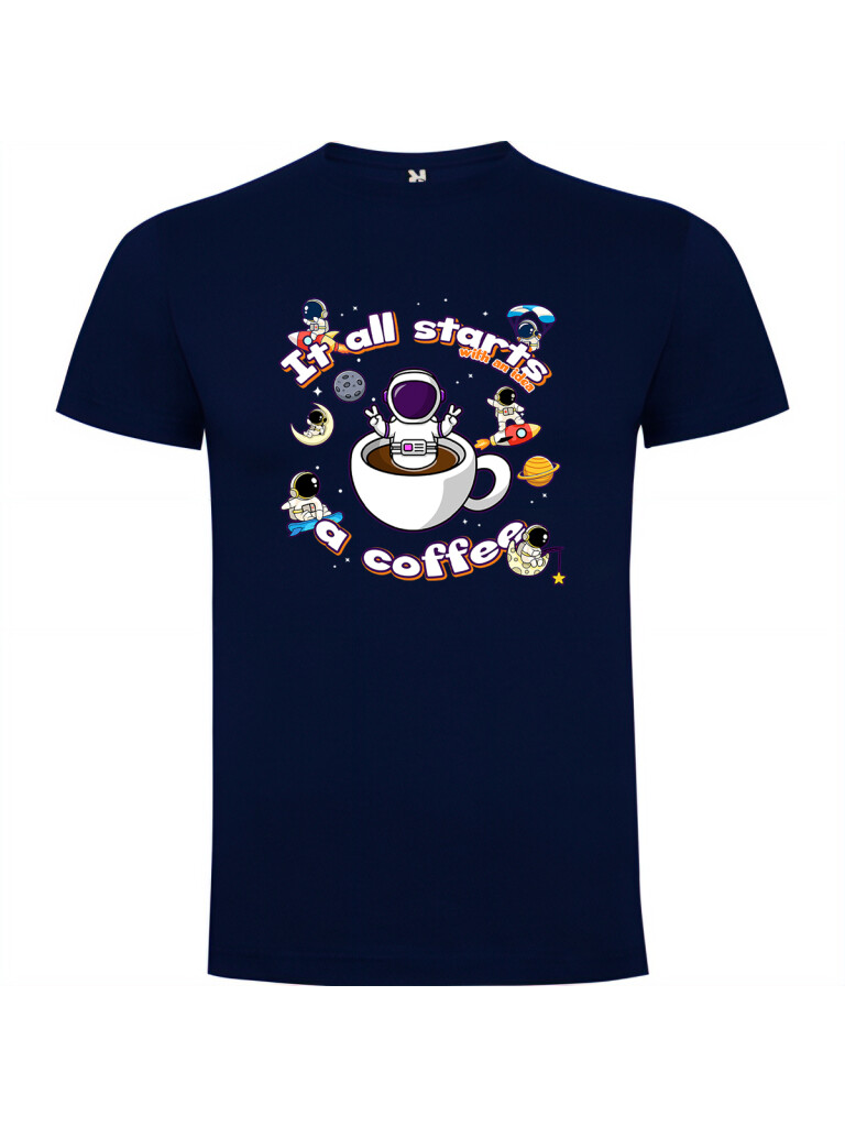 Camiseta de algodón 100% con mensaje espacial: "It all starts with a coffee", el inicio de tu aventura diaria.