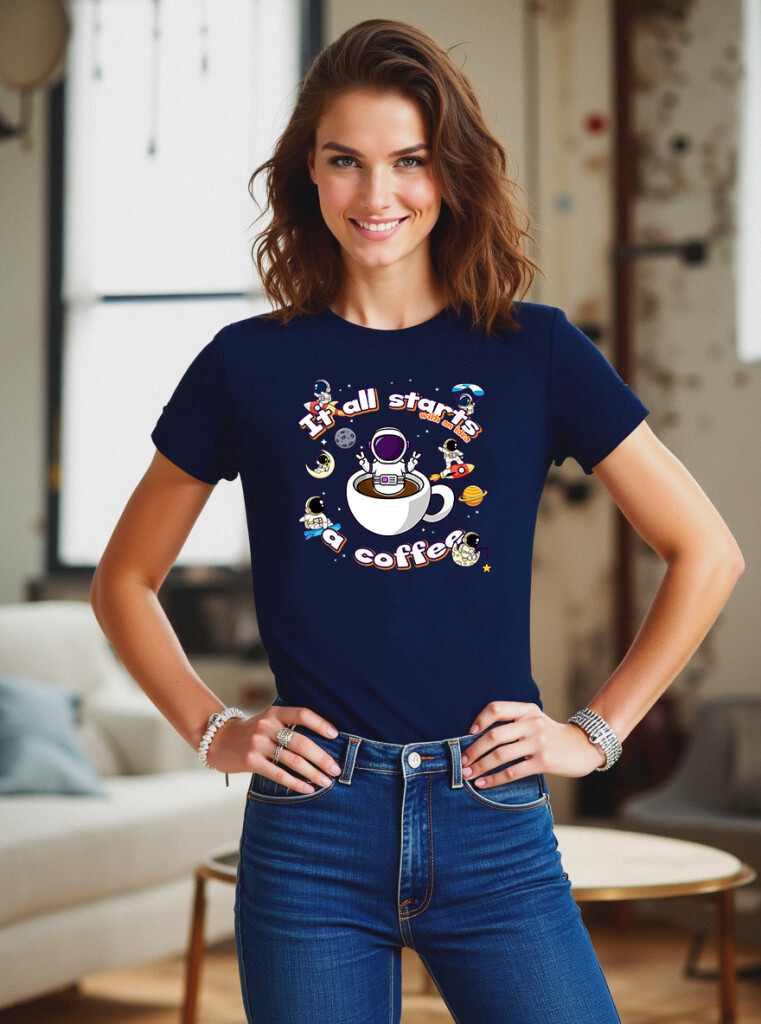 - Diseño: Estampado Camiseta Tendencias "It all starts with a coffee", con temática espacial y astronautas.